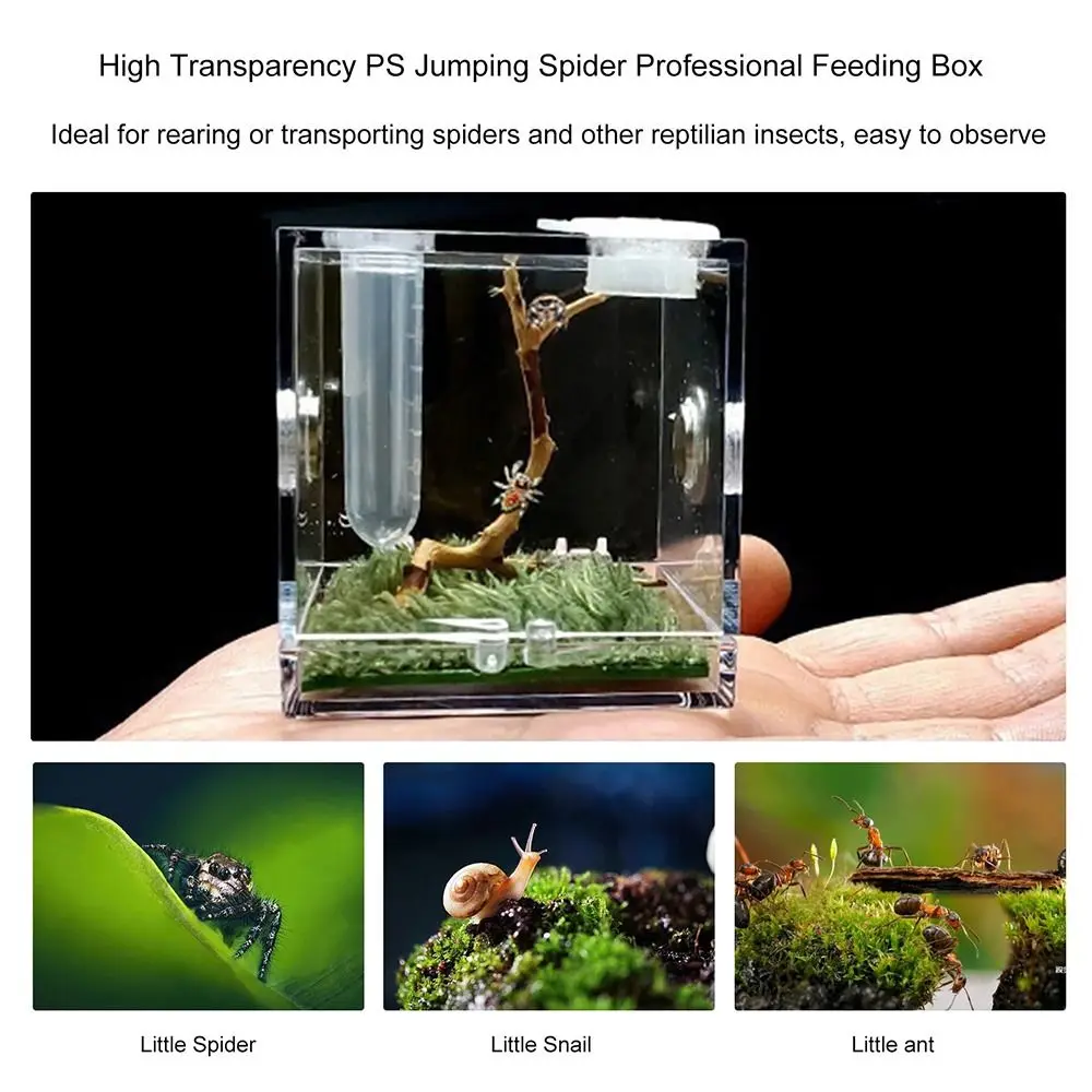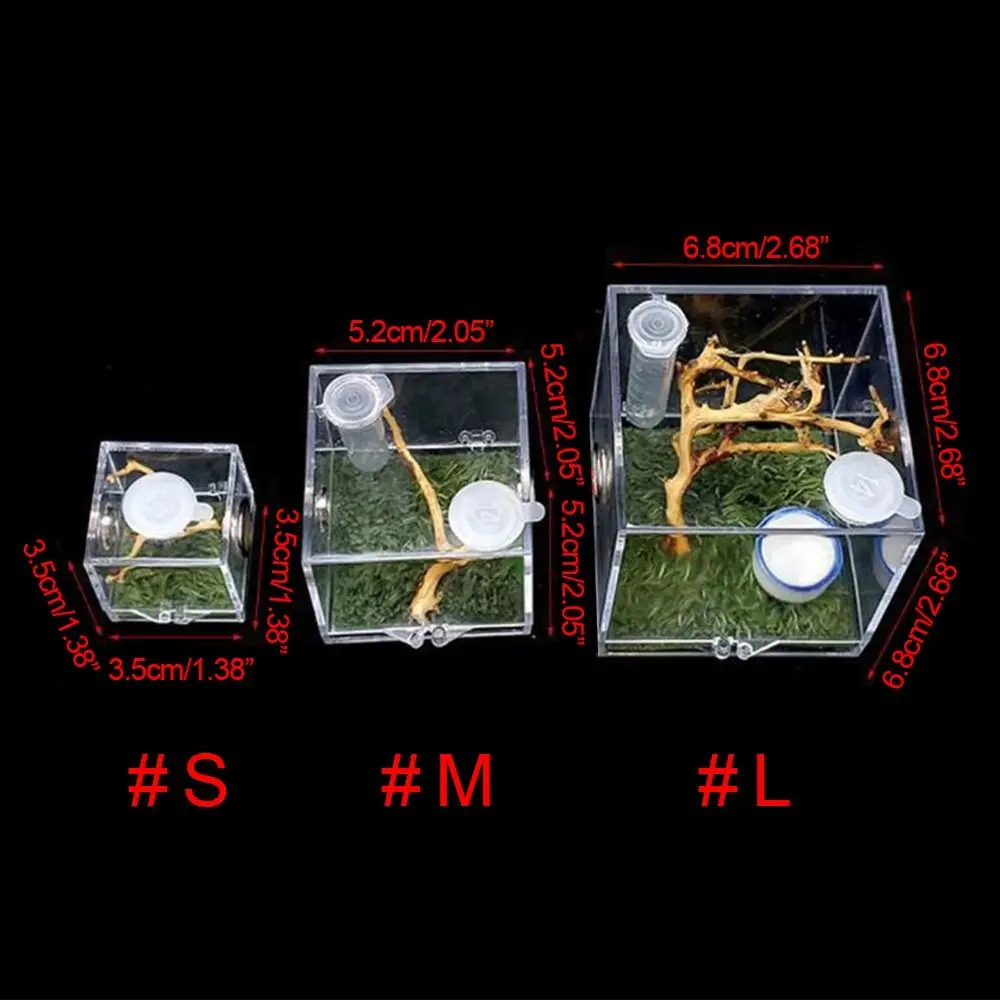 Brand new high quality Type: Jumping Spider Breeding Box Material: Plastic Color: Transparent Size:S-3.5×3.5×3.5cm/ M-5.2×5.2×5.2cm/ L-6.8×6.8×6.8cm Features: Reptile Breeding Box: Perfect for feeding or transporting small reptile insects such as jumping spiders, black widow spiders. Quality Material: Made of transparent acrylic material, clear with 360 degree view, for easy observation…